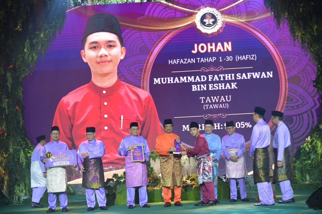 Muhammad Fathi Safwan bin Eshak muncul sebagai Johan Hafazan Tahap 1–30 (Hafiz) dengan markah cemerlang, sekali gus membuktikan keupayaan beliau menguasai keseluruhan 30 juzuk Al-Quran dengan bacaan yang tepat serta hafalan yang mantap.